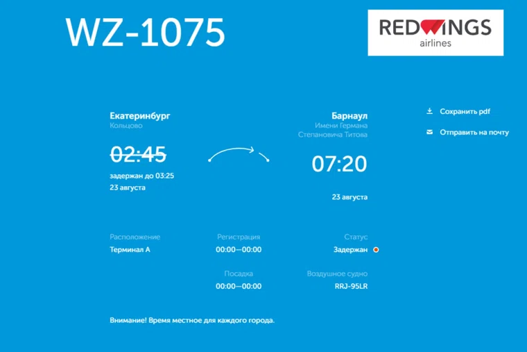 «Рейс U6-246 самолета Ural Airlines должен был отправиться из Екатеринбурга в Красноярск 23 августа в 00:25 часов, вылет воздушного судна задержан до 01:15 часов по местному времени. Вылет самолета авиакомпании Red Wings (рейс WZ-1075) был назначен на 23 августа в 02:45 часов, но и его перенесли на 03:25 часов», — следует из онлайн-табло аэропорта.