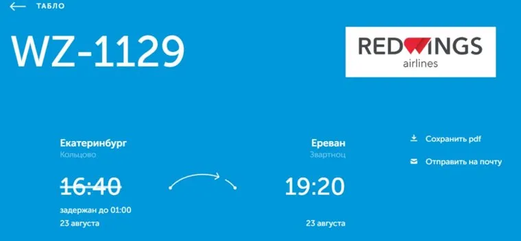 Рейс WZ-1129 должен был вылететь из Екатеринбурга в Ереван 22 августа в 16:40, однако теперь время вылета изменено на 01:00 23 августа, следует из данных на онлайн-табло аэропорта Кольцово. Причины задержки рейса на данный момент неизвестны.