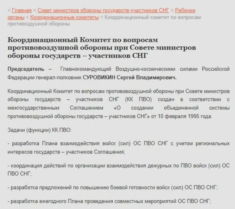 «Координационный Комитет по вопросам противовоздушной обороны при Совете министров обороны государств — участников СНГ. Председатель — <…> генерал-полковник Суровикин», — сообщается на сайте ведомства. Также об этом же говорится на сайте самого комитета по вопросам ПВО.