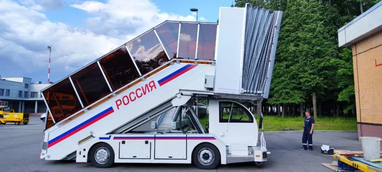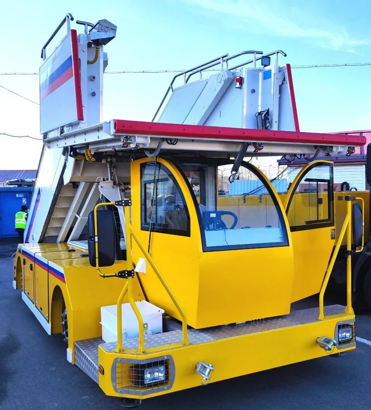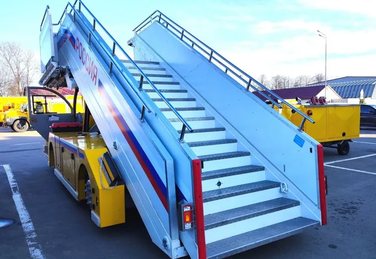 Оба отгруженных трапа представляют собой телескопическую конструкцию. По высоте она регулируется при выдвижении ступеней с их автоматической механической фиксацией. Увеличена ширина и грузоподъемность лестничных маршей и верхней площадки. Это позволит сократить время посадки и высадки пассажиров. Ступени выполнены из алюминия с антискользящим покрытием. В борта встроили освещение лестницы и платформ, которое защищено от повреждений. Спецтехнику инженеры завода оснастили аутригерами для предотвращения колебаний при посадке людей.