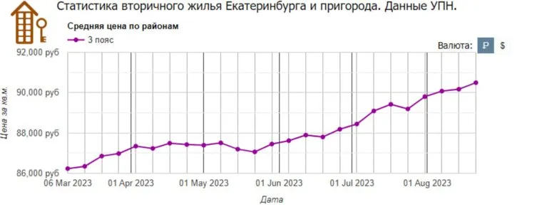 Также максимального показателя стоимости достиг квадратный метр в жилых районах третьего пояса: Елизавет, Компрессорный, Новая Сортировка, Старая Сортировка, Совхоз, Химмаш, Чермет, Сибирский, Синие камни. На 21 августа 2023 года средняя цена составляла 90,4 тысяч рублей. Нижний ценовой сегмент — 68,1 тысячи рублей, верхний ценовой сегмент — 115,3 тысячи рублей.