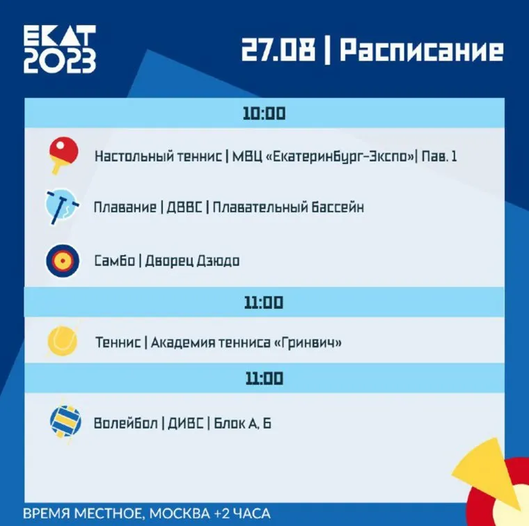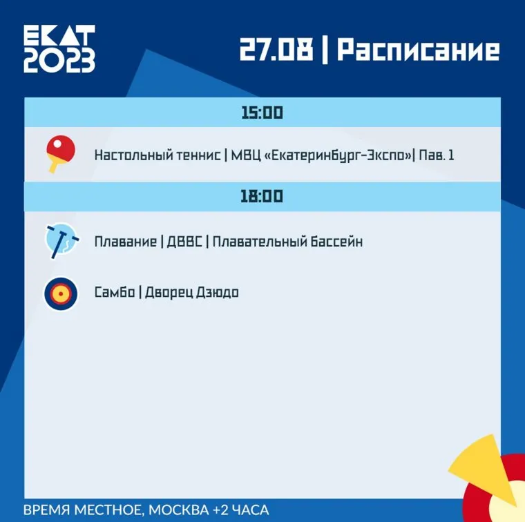 Состязания по настольному теннису, самбо, плаванию и розыгрыш 22 комплектов медалей — так пройдет еще один день Международного фестиваля университетского спорта (МФУС). Аналог Универсиады идет в Екатеринбурге с 19 по 31 августа. Расписание девятого соревновательного дня — в подборке URA.RU.