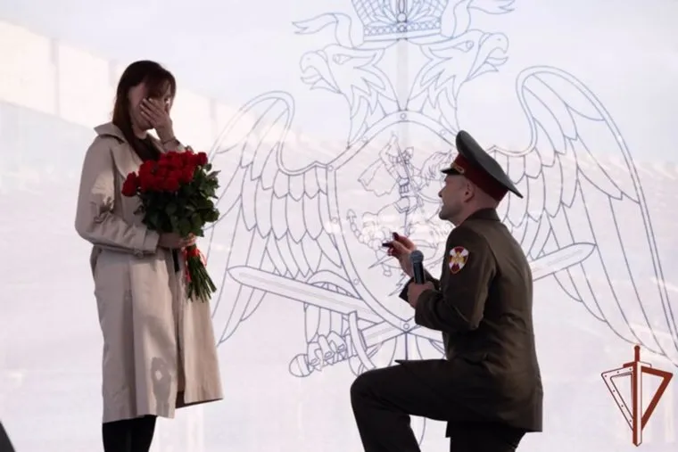«Под завершающие аккорды сводного оркестра, в присутствии руководства территориального управления Росгвардии, сослуживцев, челябинцев и гостей города росгвардеец попросил девушку выйти к нему на сцену, встал на колено и протянул своей избраннице помолвочное кольцо. Девушка сразу согласилась», — сообщили URA.RU в пресс-службе Росгвардии региона.