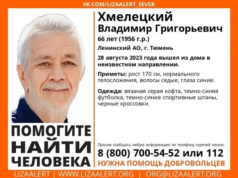 «Пропал Хмелецкий Владимир Григорьевич, 66 лет. Ленинский АО, Тюмень. 28 августа вышел из дома в неизвестном направлении», — говорится в ориентировке.