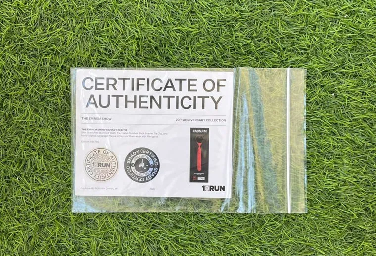 «Я хочу вас поприветствовать на Eminem Show. 20 лет спустя капсула к 20-летию из официального магазина Eminem. Галстук в рамке с зажимом и табличкой, на которой находится подпись рэпера. Стоимость 150 тысяч рублей», — следует из объявления. Раритетная рамка посвящена первому сольному альбому рэпера, изданному в 2002 году.