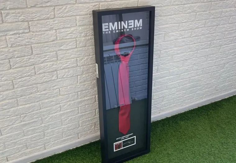 Галстук и автограф Эминема помещены в пластиковую рамку