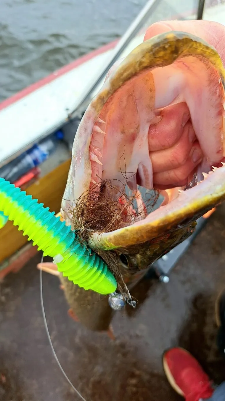 «Поймали щучку, а у нее во рту был самодельный Miuras Mouse (вид приманки — URA.RU). Сейчас ее почистим от каки-бяки и отпустим. Даже в жабры кусок сетки врос», — комментирует Пашков на видео, освобождая рыбу. После он отпускает щуку в реку.