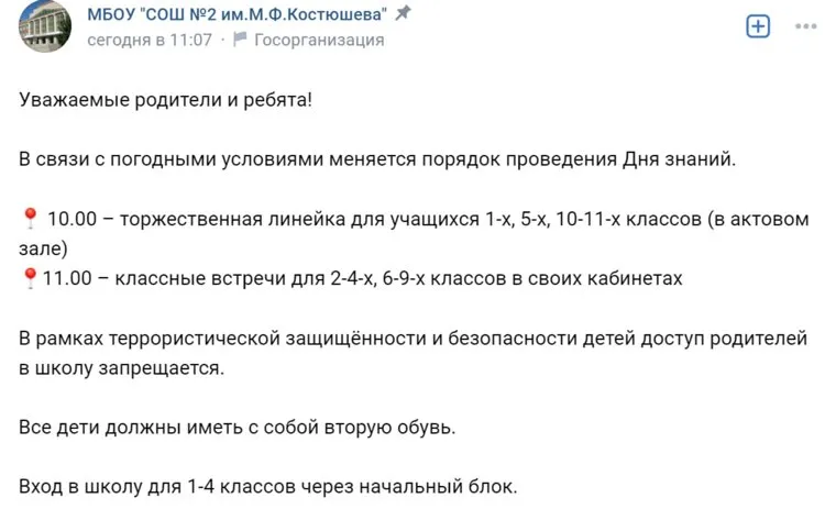 «В связи с погодными условиями меняется порядок проведения Дня знаний. В рамках террористической защищенности и безопасности детей доступ родителей в школу запрещается», — говорится в сообщении на сайте школы № 2 Еманжелинска.