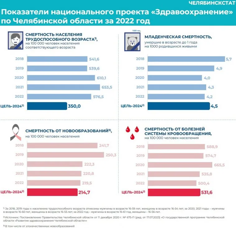 «Показатель смертности в расчете на 100 тысяч человек населения составил в 2022 году 576,5 человека. В предыдущие два года цифра росла», — отметили в Челябинскстате на своей инфографике.