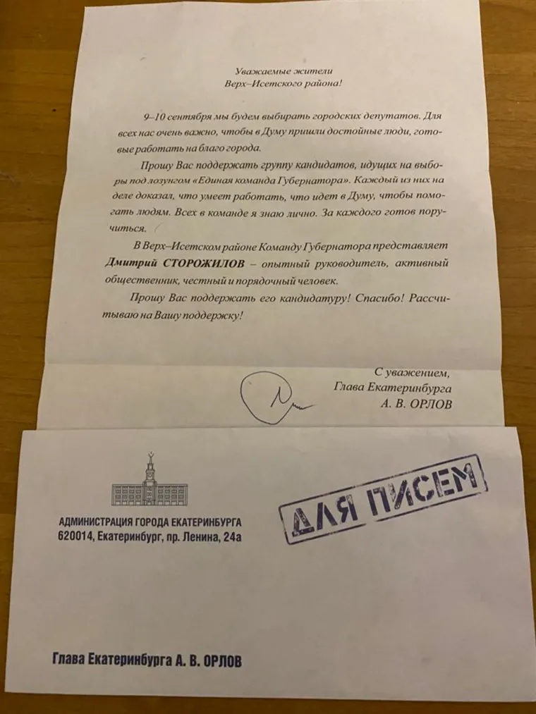 Жители Верх-Исетского района Екатеринбурга получили письма от имени главы города Алексея Орлова, где якобы он, лидер списка «Единой России» на выборах в гордуму, просит проголосовать за сотрудника УГМК Дмитрия Сторожилова — кандидата от администрации и ЕР в округе №3. Одним из таких писем с URA.RU поделился читатель.