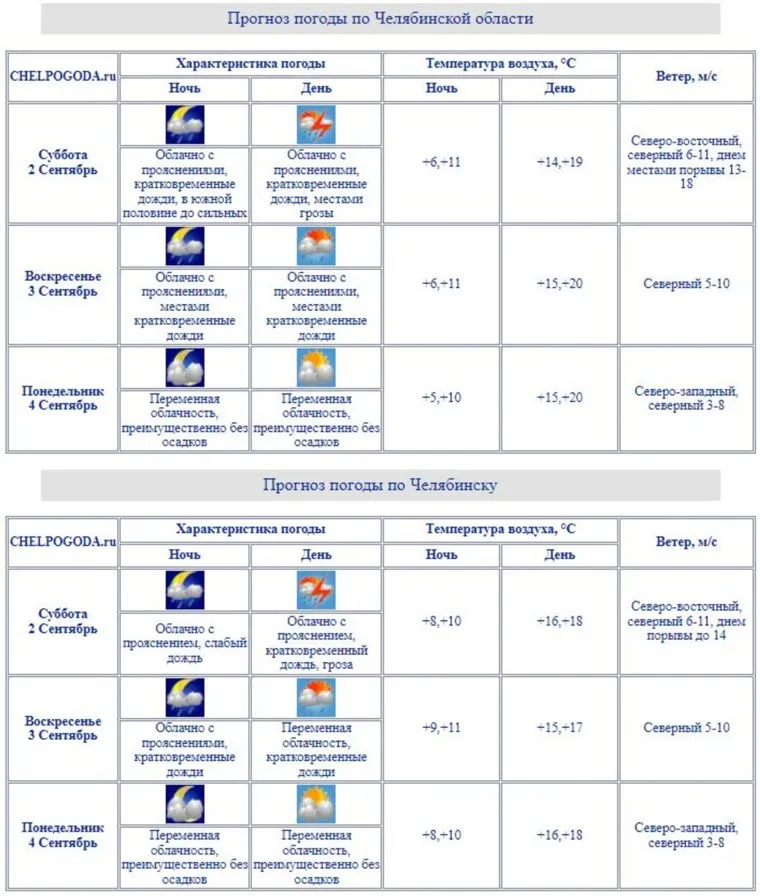 «В регионе 4 сентября будет преимущественно без осадков. В выходные с 2 по 3 сентября дожди не отступят. В субботу ожидается гроза, порывы ветра достигнут 13-18 метров в секунду. В эти три дня температура воздуха ночью будет колебаться в пределах 5-11 градусов, днем — 14-20», — уточнили в челябинском ЦГМС.