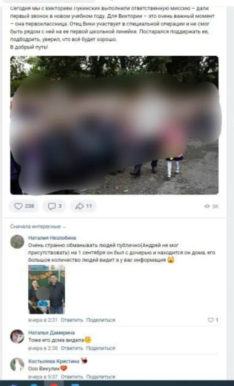 Местные жители удивились этим словам и написали в комментариях под постом, что видели отца Вики Андрея Лукинских дома и на линейке во время мероприятия. «Очень странно обманывать людей публично сообщением о том, что Андрей не мог присутствовать. 1 сентября он был с дочерью и находится дома», — пишет жительница в комментариях. По ее словам, Андрея видело много людей. Еще одна женщина также написала под постом, что «тоже видела его дома».
