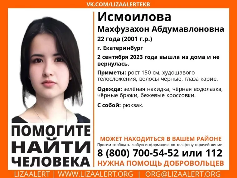 В Екатеринбурге волонтеры ищут ушедшую из дома 2 сентября 22-летнюю Махфузахон Исмоилову. Об этом сообщили в поисковом отряде «ЛизаАлерт».