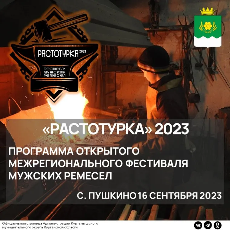 «16 сентября пройдет первый региональный фестиваль „Растотурка-2023“, где будет можно окунуться в атмосферу брутальных исконных мужских ремесел», — сообщает афиша на странице мэрии. Во время фестиваля пройдут молодецкие игры, состоятся обряды «Сжигание негатива» и «Кузнечная свадьба», гостей пригласят на хоровод.