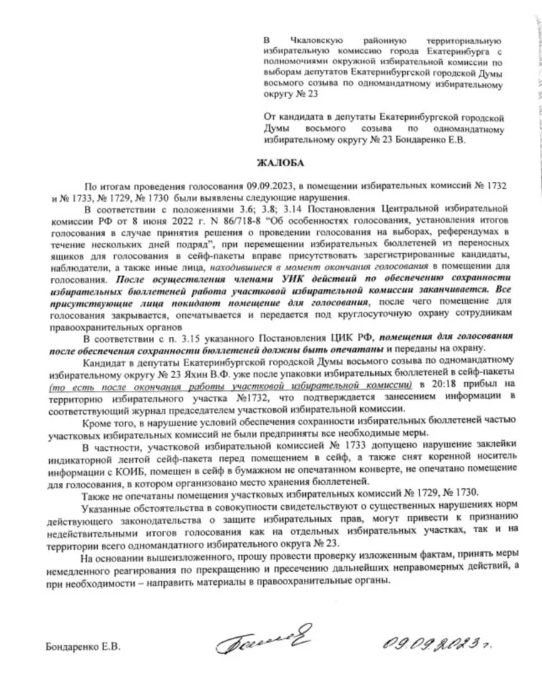 22:33 Бондаренко направила в Чкаловскую ТИК еще одну жалобу. Депутата возмутило, что ее оппонент Яхин пришел на один из участков уже после того, как бюллетени упаковали в сейф-пакеты. Кроме того, ей не понравилось, как сотрудники другого УИК обращались с сейф-пакетами и КОИБами. «Также не опечатаны помещения участковых избирательных комиссий №1729 и №1730», — добавила Бондаренко.