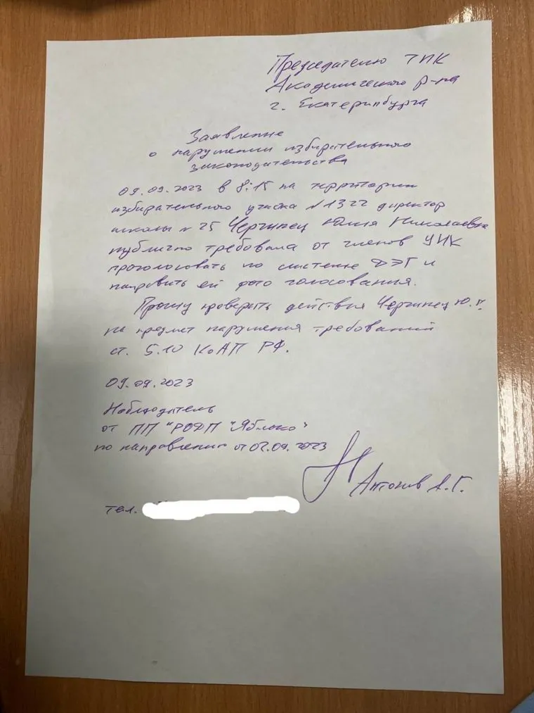 11:32 На участке 1322 наблюдатель от партии «Яблоко» Алексей Антонов написал заявление о нарушениях при голосовании. По его словам, на избирательном участке директор школы просила коллег проголосовать по системе ДЭГ. В Центре общественного наблюдения информацию опровергли, предоставив видео от руководителя учебного заведения.