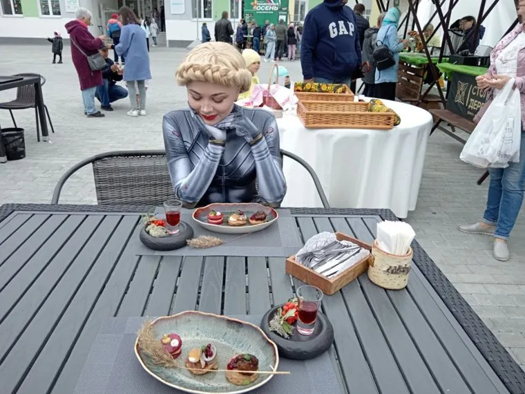 10:34 На фестивале «Вкусы Тюменской осени» оладьи продегустировала девушка в образе персонажа игры Atomic Heart.