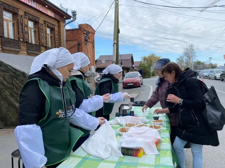 13:51 Желающих угоститься вкусной и горячей гречневой кашей ждут у Центра татарской культуры. Там же можно приобрести товары местных производителей.