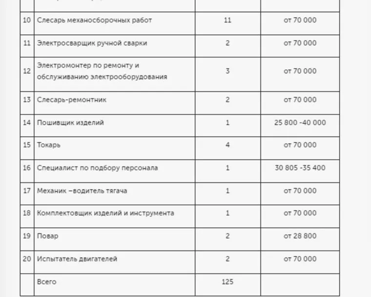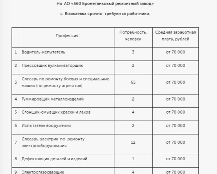 «На АО „560 Бронетанковый ремонтный завод“ селе Возжаевка срочно требуется 65 слесарей по ремонту боевых и специальных машин, 12 слесарей-электриков по ремонту электрооборудования, 11 слесарей механосборочных работ. Заработная плата: от 70 000 рублей», — указано в документе.