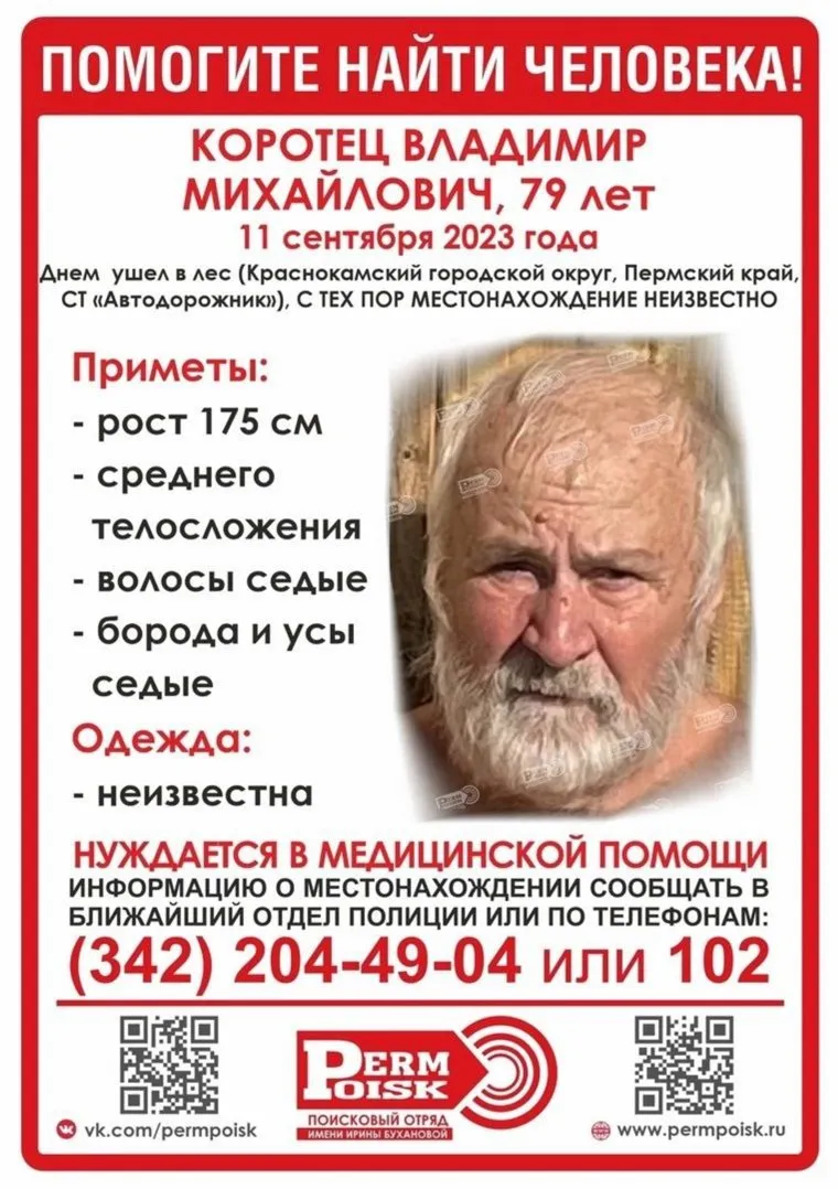 «Пропал Владимир Коротец, 79 лет. 11 сентября 2023 года ушел в лес (Краснокамский округ, Пермский край, СТ „Автодорожник“). С тех пор его местонахождение неизвестно», — передает telegram-канал регионального отряда имени Ирины Бухановой. Волонтеры просят оказать помощь в поиске пропавшего.