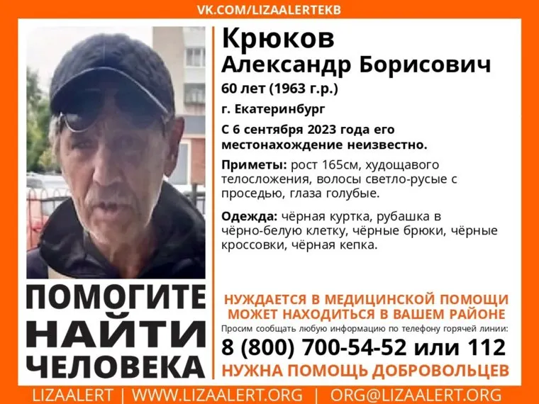 В Екатеринбурге с 6 сентября идут поиски 60-летнего Александра Крюкова. Об этом рассказали в поисковом отряде «ЛизаАлерт».