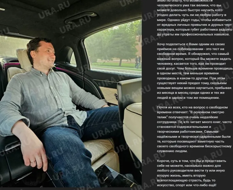 Директор «Регионального института управления» ХМАО Владимир Аникин заявил, что почти из всех, кто на вопрос о свободном времени отвечает, что предпочитает смотреть телевизор, получаются недалекие сотрудники. Свои наблюдения он опубликовал на личной странице в соцсети «ВКонтакте», сопроводив пост фото из салона автомобиля Maybach.