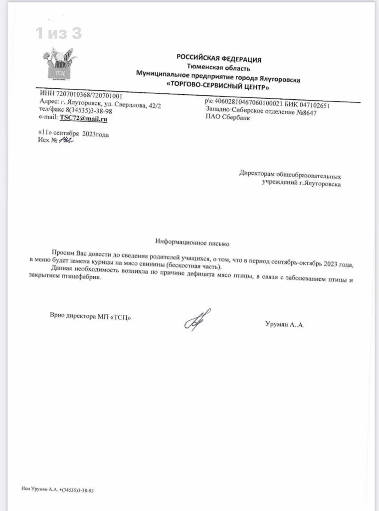 Письмо, которое отправили в школы Ялуторовска, имеется в распоряжении редакции. Отправителем указано муниципальное предприятие города «Торгово-Сервисный центр», в адрес компании направлен письменный запрос.
