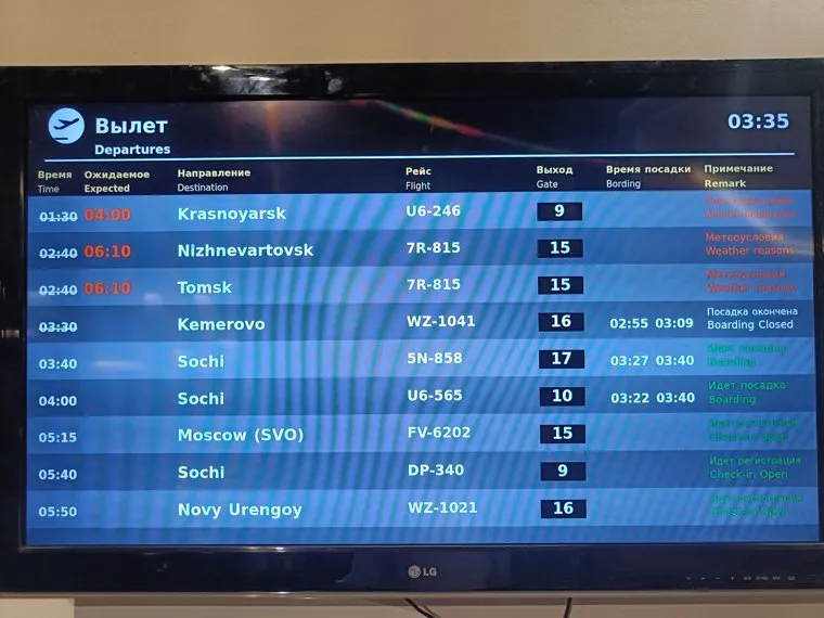 «7R-815 по маршруту Екатеринбург — Нижневартовск — Томск. По расписанию самолет авиакомпании „РусЛайн“ из Екатеринбурга в Нижневартовск и Томск должен был вылететь в 02:40, а выдвинется в 06:10. Причина задержки рейса — метеоусловия», — написано на сайте авиакомпании.
