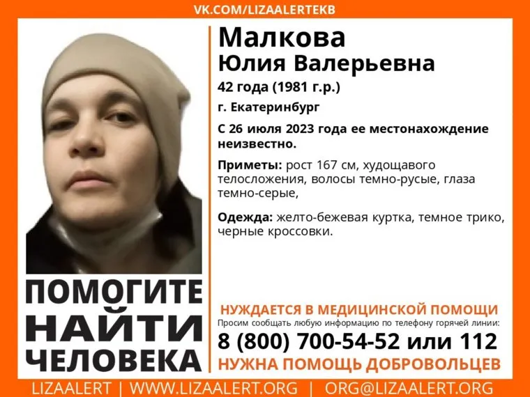В Екатеринбурге полиция и волонтеры ищут пропавшую 26 июля 42-летнюю Юлию Малкову. Об этом сообщили в поисково-спасательном отряде «ЛизаАлерт».