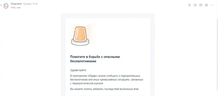 «Помогите в борьбе с опасными беспилотниками! В приложении „Радар“ можно сообщить о подозрительных беспилотниках или чрезвычайных ситуациях, связанных с террористической угрозой. Вы можете помочь избежать последствий возможных атак», — говорится в письме.