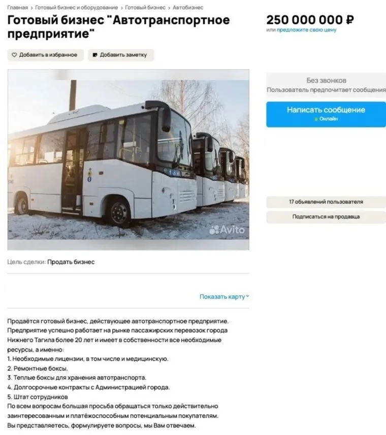 Накануне, 19 сентября, на интернет-площадке Avito разместили объявление о продаже за 250 миллионов рублей предприятия, которое больше двадцати лет «успешно работает на рынке пассажирских перевозок» Нижнего Тагила. За эту сумму покупателю обещают штат сотрудников, гаражные боксы, лицензии и контракты на перевозки.
