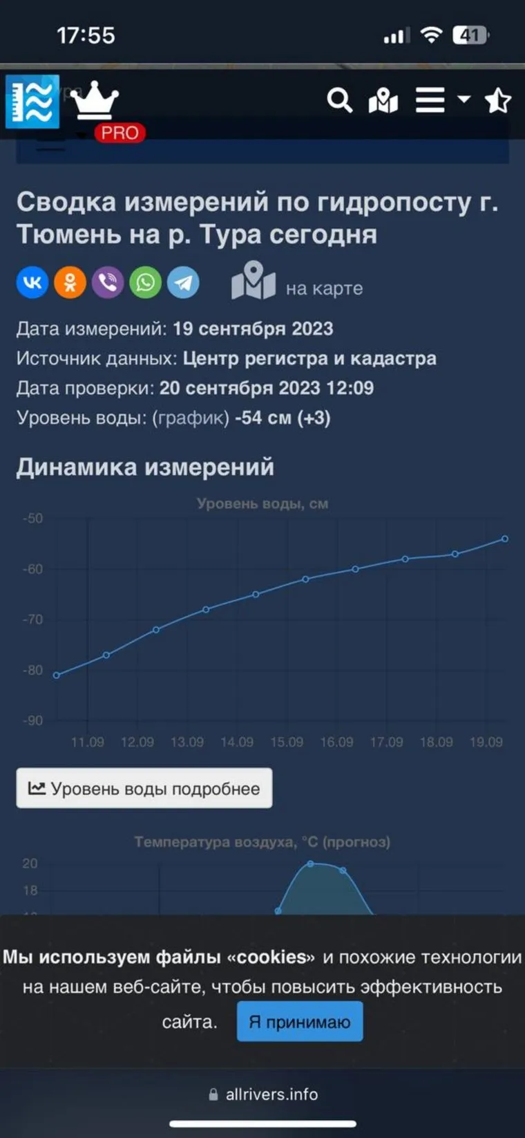 «На 19 сентября 2023 года уровень воды в реке Тура составляет -54 см над нулем. За прошедшие 24 часа уровень повысился на три см. На 12 сентября уровень составлял -72 см», — сообщили в тюменской гидропосте.