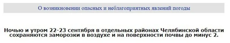 В Челябинской области ночью 22 и 23 сентября сохранятся заморозки. Температура опустится до минус двух градусов. Такое экстренное предупреждение было размещено на официальном сайте регионального гидрометцентра.