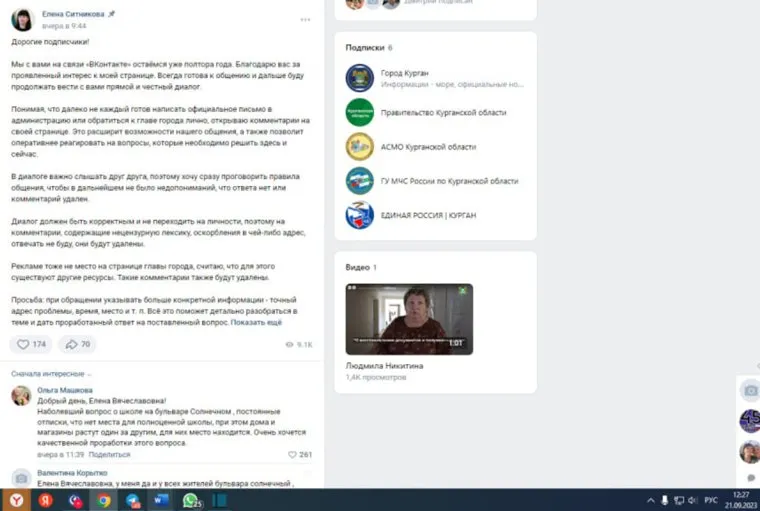 Мэр Кургана Ситникова закрыла комментарии на обед. Скрин