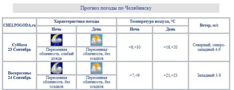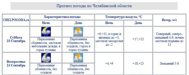 «В регионе 23 и 24 сентября будет переменчивая облачность, без осадков. В ночь на 23 сентября возможны небольшие дожди, туманы и порывы ветра до 13 метров в секунду. Температура воздуха ночью в эти два дня будет опускаться до 4—11 градусов. В горах и низинах — до одного градуса, а местами — до минус двух. Днем воздух будет прогреваться до 17—23 градусов», — уточнили в челябинском ЦГМС.