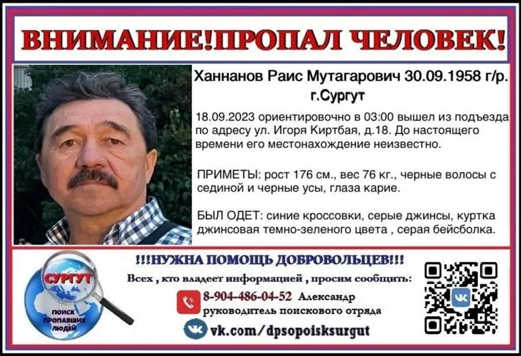 «Внимание! Пропал человек! Ханнанов Раис Мутагарович 30.09.1958 года рождения, город Сургут. 18 сентября 2023 года в 3.00 вышел из подъезда по адресу улица Игоря Киртбая дом 18. До настоящего времени его местонахождение неизвестно», — сообщается в сообществе «ДПСО Сургут» в соцсети «ВКонтакте».