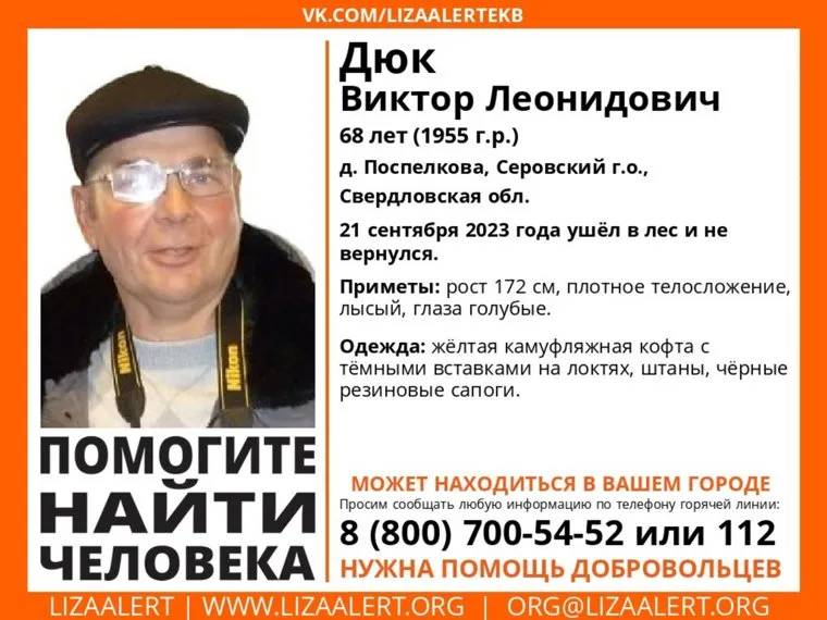 Волонтеры и полиция с 21 сентября ищут 68-летнего Виктора Дюка, который ушел в лес возле деревни Поспелкова (Свердловская область) и пропал. Об этом сообщили на официальном сайте поисково-спасательного отряда «ЛизаАлерт».