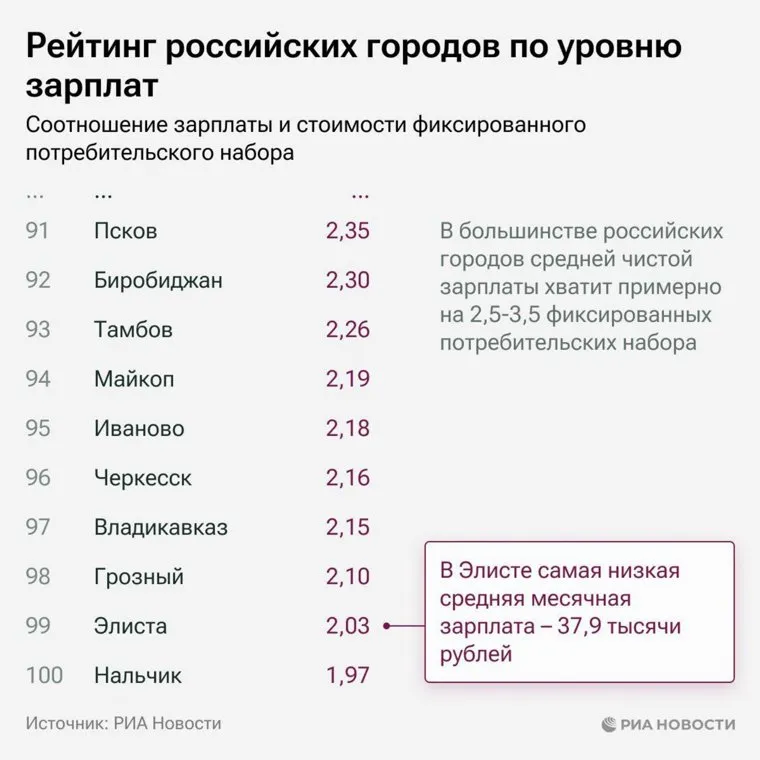Аутсайдерами названы: Нальчик, Элиста и Грозный. В Элисте зафиксированы самые низкие зарплаты — 37,9 тысячи рублей.