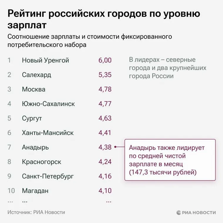 Новый Уренгой и Салехард обошли Москву по уровню зарплат. Инфографика