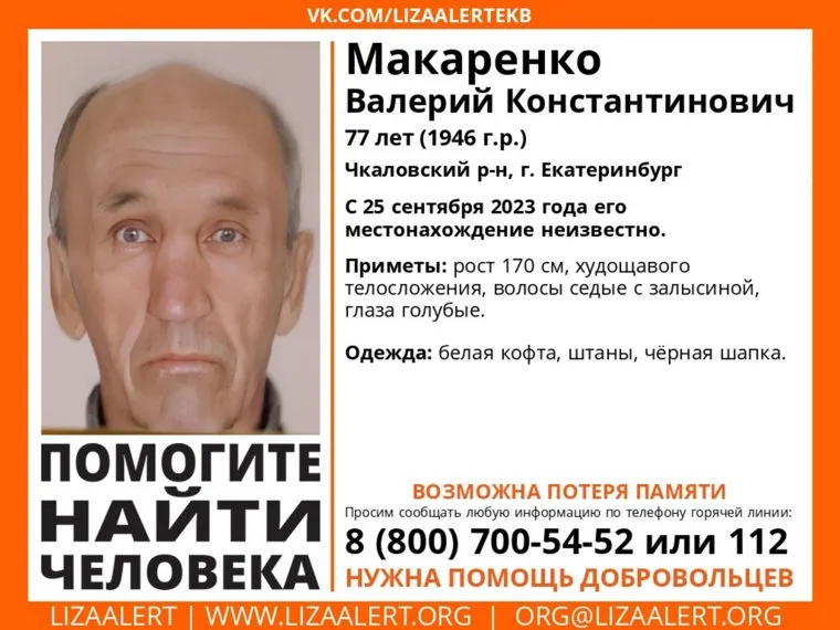 В Екатеринбурге 25 сентября идут поиски 77-летнего Валерия Макаренко. У мужчины возможна потеря памяти, сообщили в поисково-спасательном отряде «ЛизаАлерт».