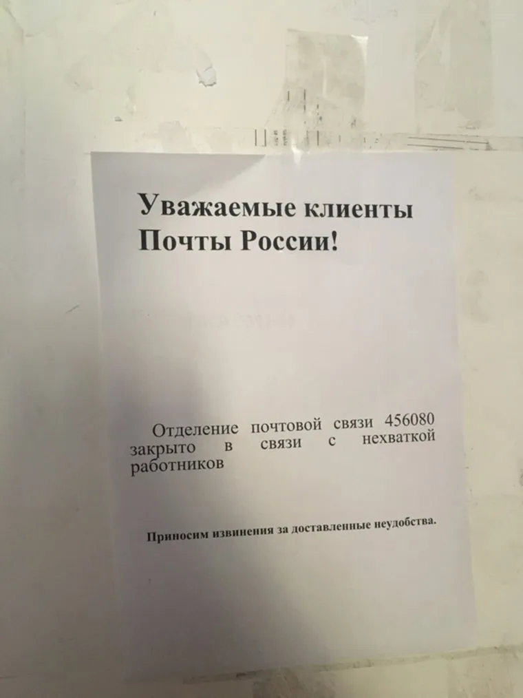 «Уважаемые клиенты Почты России! Отделение почтовой связи 456080 (по улице Карла Маркса, 47 — прим URA.RU) закрыто в связи с нехваткой работников. Приносим извинения за доставленные неудобства», — указано в объявлении, фото которого горожане разместили в паблике «Подслушано | Трехгорный» в социальной сети «ВКонтакте».