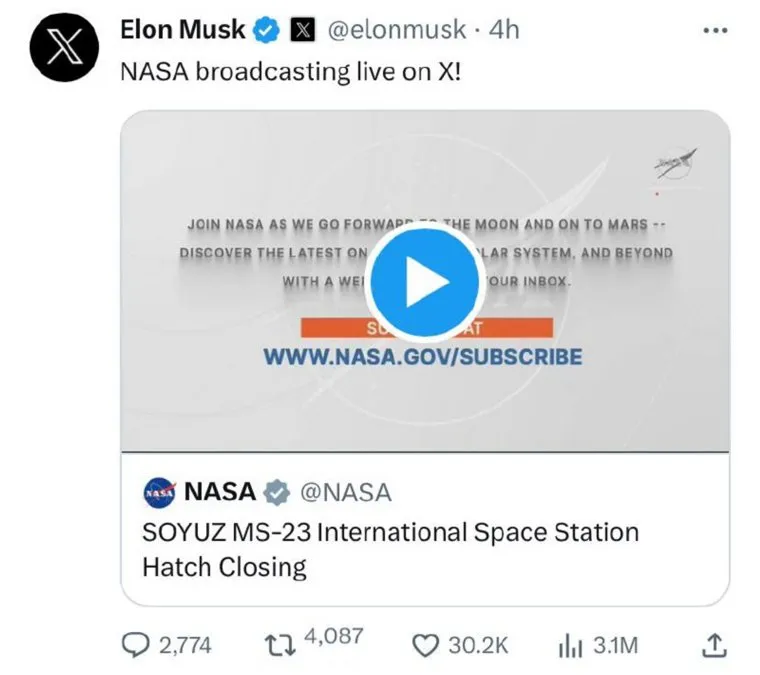 «NASA ведет прямую трансляцию на Х», — написал Маск в своем аккаунте. Также он добавил к сообщению ссылку на прямой эфир, где будет показана посадка уральских космонавтов.