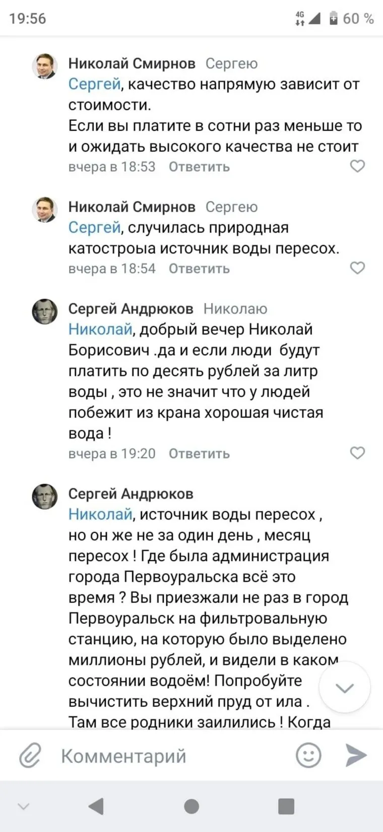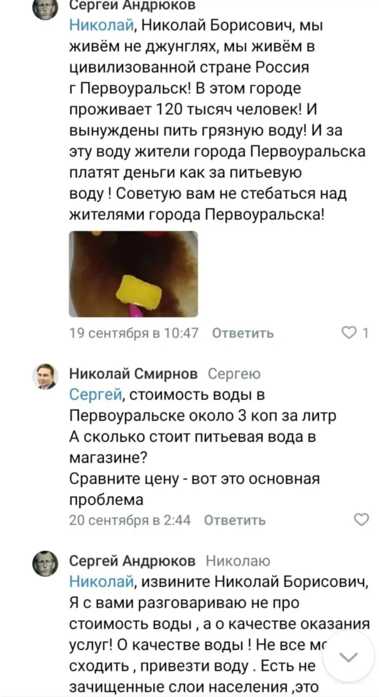Первоуральцы, в свою очередь, ответили чиновнику, что живут «не в джунглях, а в цивилизованной стране Россия». Возмутило их и упоминание о копеечной цене за воду. «Даже если мы будем платить по 10 рублей за литр, это не значит, что у людей из кранов побежит хорошая, чистая вода», — высказался житель города Сергей Андрюков.