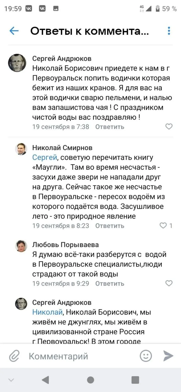 Министр энергетики и ЖКХ Свердловской области Николай Смирнов привел в пример Маугли и обитателей джунглей жителям Первоуральска, которые пожаловались ему на грязную воду из-под крана. Также чиновник указал уральцам в переписке в соцсети «ВКонтакте», что они платят за воду копейки.