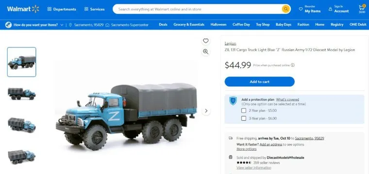 «Крупнейшая торговая сеть США Walmart, интернет-магазин Amazon и Ebay начали продавать игрушечный военный грузовик ЗИЛ-131 с символом Z на двери», — пишет издание. Там отмечают, что цена такой игрушки составляет 45 долларов. После жалоб украинских пользователей товар удалили с сайтов и грузовик перестал быть доступен для покупки, заключили в материале.