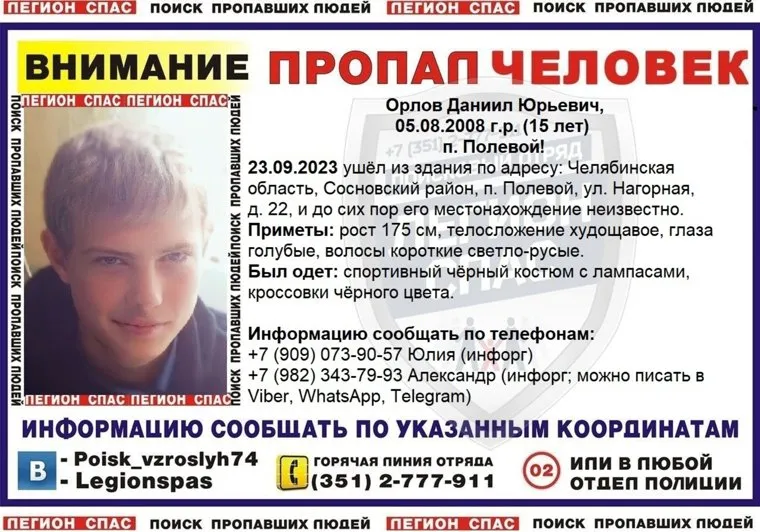 «Орлов Даниил Юрьевич, родился 5 августа 2008 года, ушел из дома 23 сентября и до сих пор его местонахождение неизвестно. Был одет в спортивный черный костюм с лампасами и кроссовки черного цвета», — говорится в сообщении профильной группы поискового отряда «Легион Спас» в соцсети «ВКонтакте».