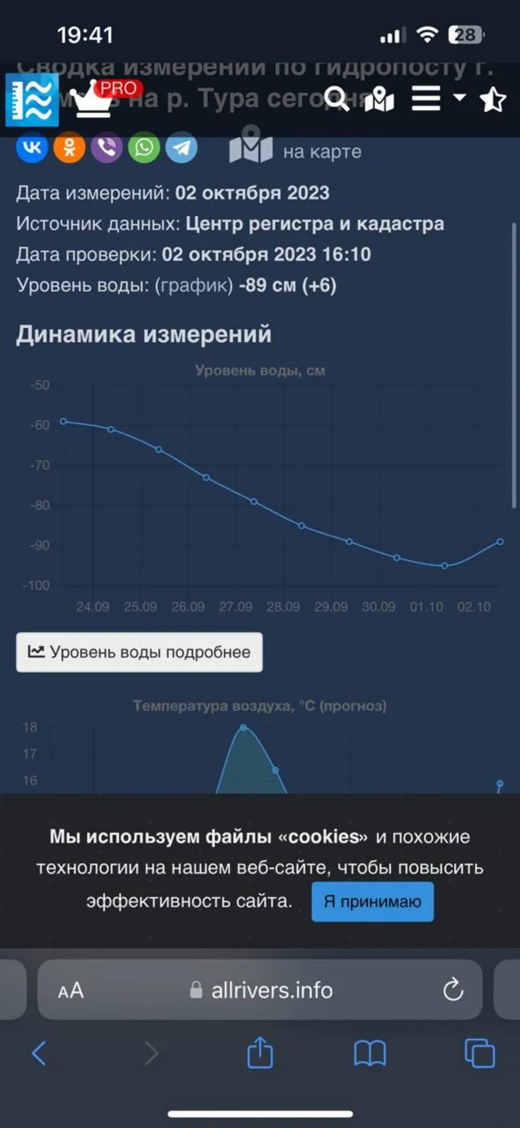 «На 2 октября 2023 года уровень воды в реке Тура по данным гидропоста, находящегося в городе Тюмень, составляет -89 см над нулем поста. За прошедшие 24 часа уровень повысился на 6 см», — сообщается на сайте сервиса.