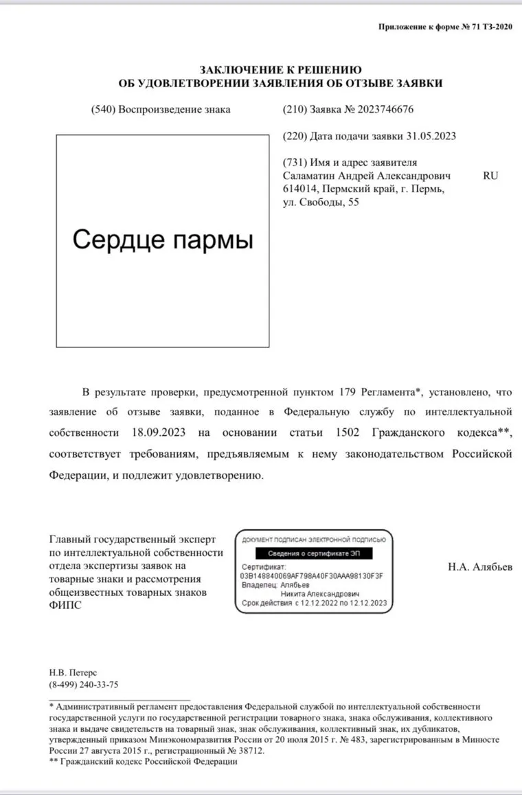 «18 сентября уже отозвана моя заявка на регистрацию товарного знака „Сердце пармы“. А также 20 сентября зарегистрирована заявка на прекращение охраны зарегистрированного товарного знака „Сердце пармы“», — сообщил предприниматель URA.RU. В соцсети «ВКонтакте» он также опубликовал соответствующие скриншоты с сайта Роспатента.