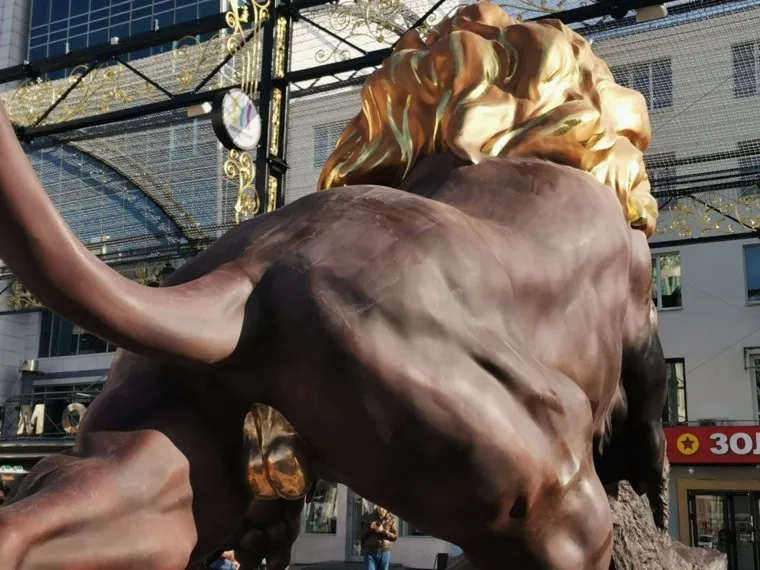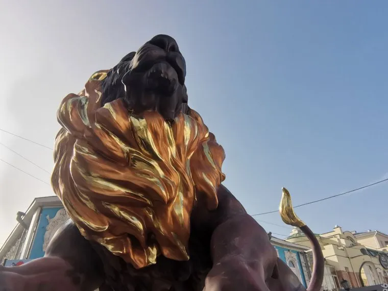 В Екатеринбурге рядом с медиаэкраном на улице Вайнера ночью появилась огромная скульптура льва с позолоченной гривой, светящимися глазами и — это, наверное, самая яркая деталь — большими, отливающими золотом бронзовыми яйцами. Как рассказали URA.RU сотрудники компании «Сима-ленд», животное стало одним из подарков любимому городу.