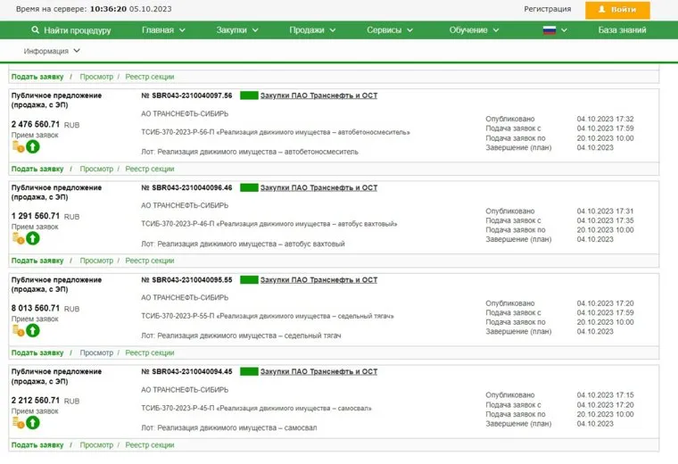«Лоты с различными номерами, с разной стартовой ценой. Во всех случая продавец — АО „Транснефть — Сибирь“, во всех случаях продается движимое имущество. Заявки по всем торгам принимаются до 20 октября», — сообщает платформа.